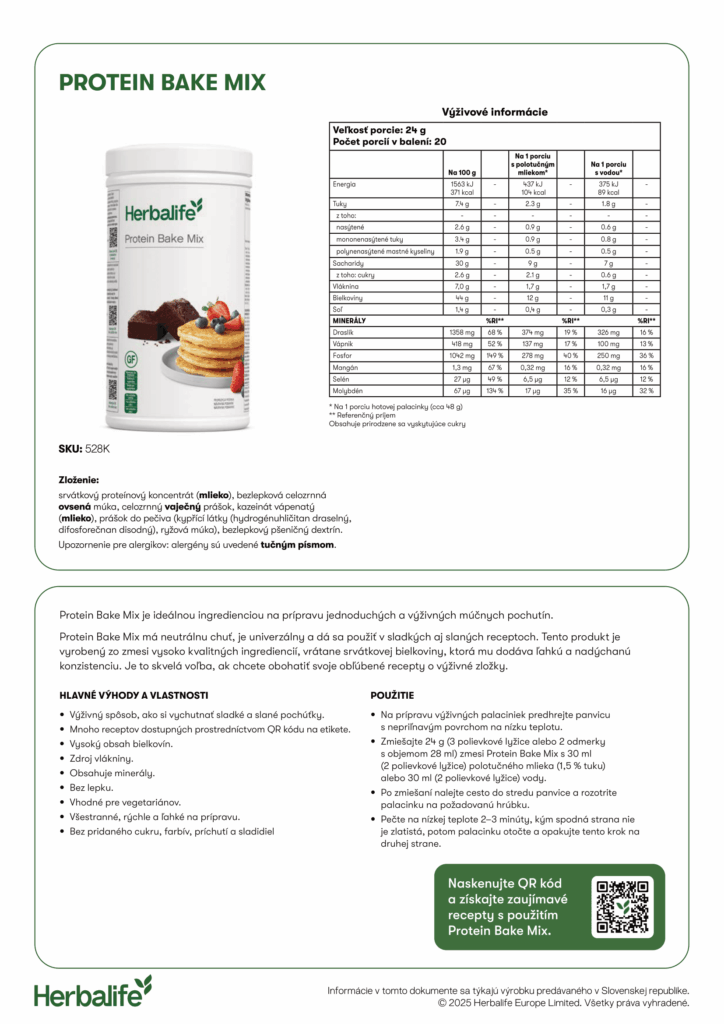 Herbalife Protein Bake Mix je starostlivo vytvorený tak, aby poskytoval vyvážený profil živín, takže vaše pečené dobroty nielen skvele chutia, ale aj vyživujú vaše telo. S prvotriednym srvátkovým proteínom obsahuje tiež dôležité minerály a je zdrojom vlákniny.